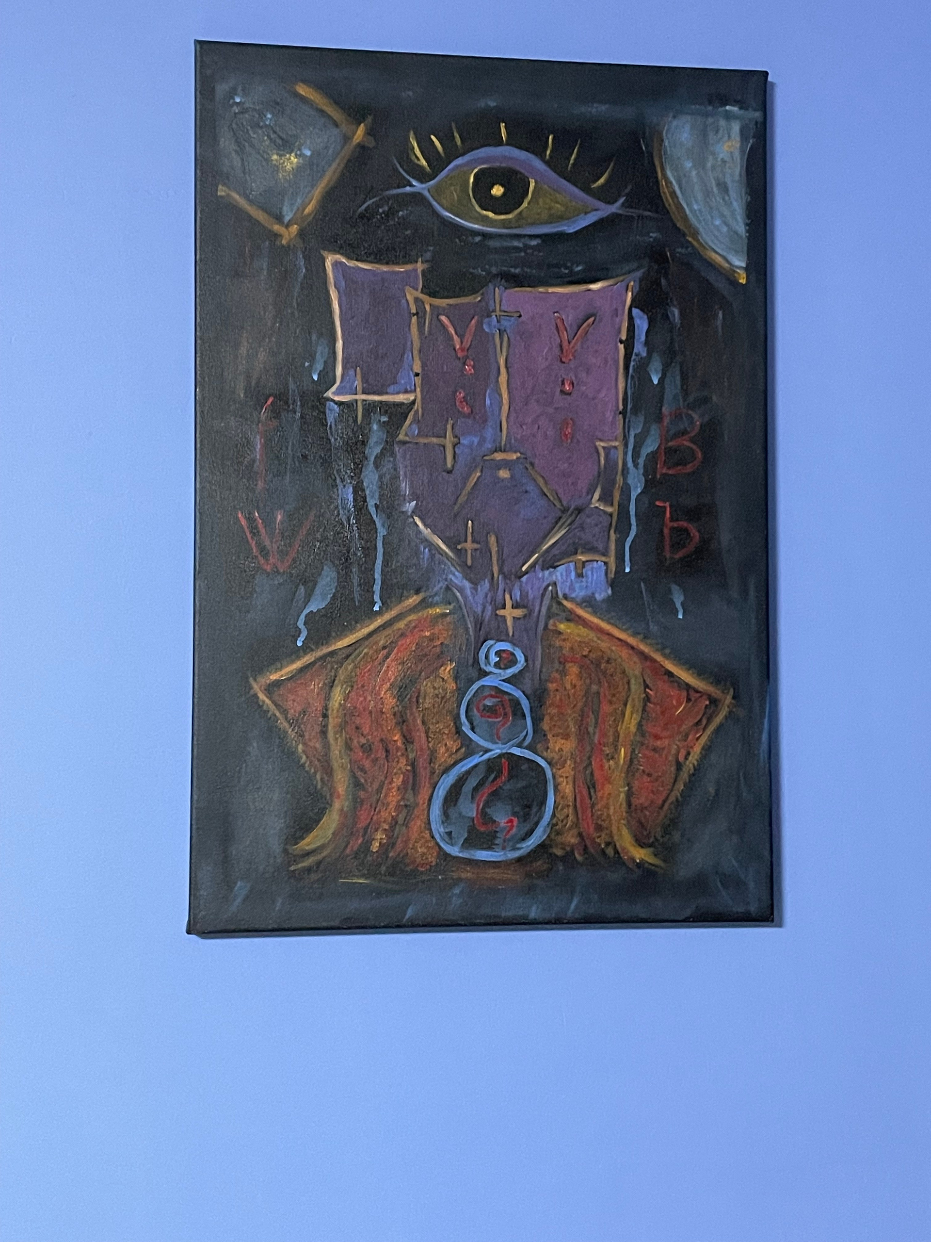 Картина содержит перекрывающиеся образы, где лицо Еноха и его «небесное соответствие» соединены воедино. Теплые и холодные тона подчеркивают контраст между земными и божественными аспектами. Тёплые оттенки могут ассоциироваться с человеческой сутью, тогда как холодные и насыщенные цвета символизируют ангельскую природу. - Лица и символизм: